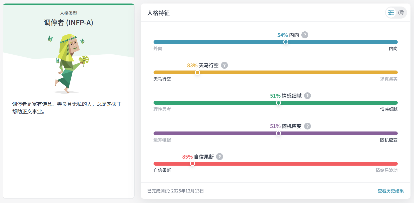啊哈,有没有感觉很神奇。我除了是一个绝对的N人之外,其他的性格都可以根据环境去进行微调。所以我觉得自己的伸缩性很高。(沾沾自喜ing)